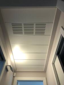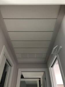 Realizzazione di un controsoffitto in doghe di legno ispezionabile, una soluzione che unisce eleganza e funzionalità. Grazie al sistema ispezionabile, è possibile accedere facilmente agli impianti tecnici nascosti mantenendo un design moderno e ordinato.
